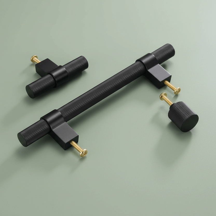 Schwarzer Griff für Küchenschränke oder Möbel aus massivem Messing mit einer gerillten Grifffläche in industriellem Design. Die gerillte Oberfläche und die Befestigungsteile in gebürsteter Ausführung machen den Griff zu einem stilreinen Detail. Passt gut in moderne Küchen, in denen klare Linien und Stilreinheit Hand in Hand gehen. Der Griff besteht aus massivem Messing, welches mit einer Beschichtung behandelt wurde, was für seine perfekte Farbe und schützende Oberfläche sorgt. Perfekt kombinierbar mit den T-Bars und Knöpfen der Serie 3138 für eine gelungene und einheitliche Inneneinrichtung.